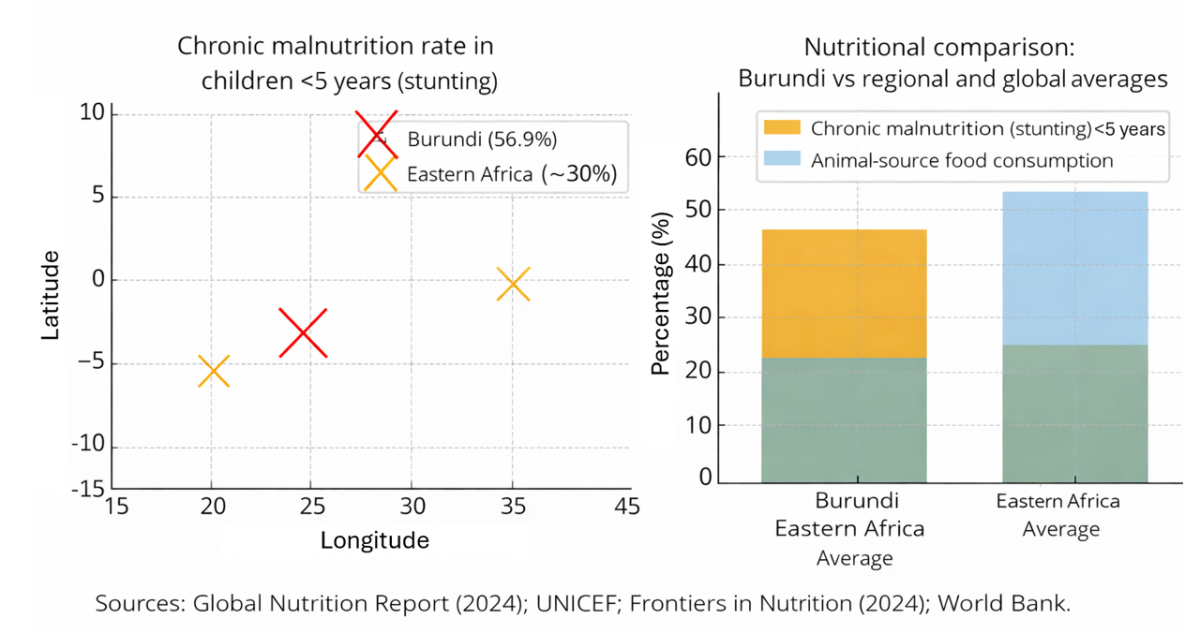 Burundi has a food system based on a very poor economy, with the highest rate of child malnutrition in the world and a deficit of animal-source protein of more than 85% among children under the age of five. Especially in rural areas, there is limited availability of nutritious foods, with serious consequences for children's physical and cognitive development and long-term impacts on the entire community.